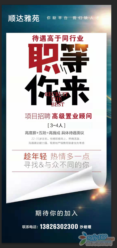 正文摘要:熟手,無責(zé)任底薪3500元/月,完成任務(wù)追加至5000元/月。提成2000-9000元/套不等。順達雅苑現(xiàn)房銷售,無需守盤,貨源充足,發(fā)傭快。年齡不限 |